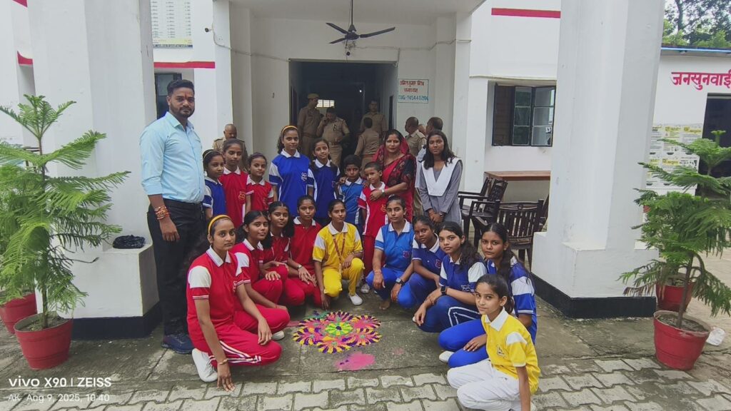 छात्राओं ने थाना परिसर में रंगोली बनाकर माहौल को और सुंदर बना दिया।