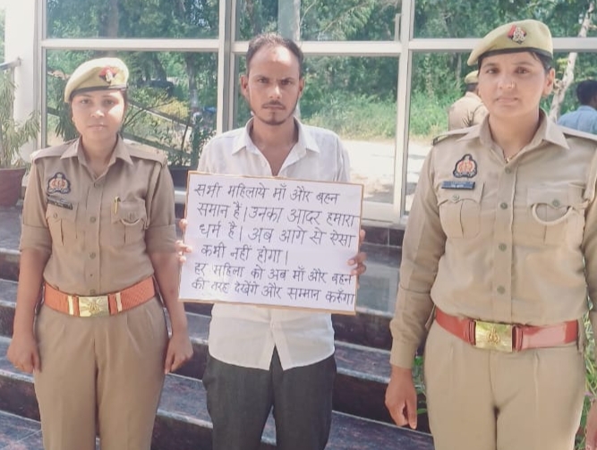 आज़मगढ़। जिले के कप्तानगंज थाना क्षेत्र में शादी का झांसा देकर दुष्कर्म करने वाले आरोपी को पुलिस ने गिरफ्तार कर लिया। हैरानी की बात यह रही कि गिरफ्तारी के बाद  थाना परिसर में आरोपी के हाथ में एक तख्ती पकड़ा दी गई, जिस पर लिखा था ‘सभी महिलाएं मां और बहन के समान हैं, उनको उसी नजर से देखेंगे, उनका सम्मान हमारा धर्म है, आगे से गलती नहीं होगी।’ यह नजारा आज  चर्चा का विषय बना है।