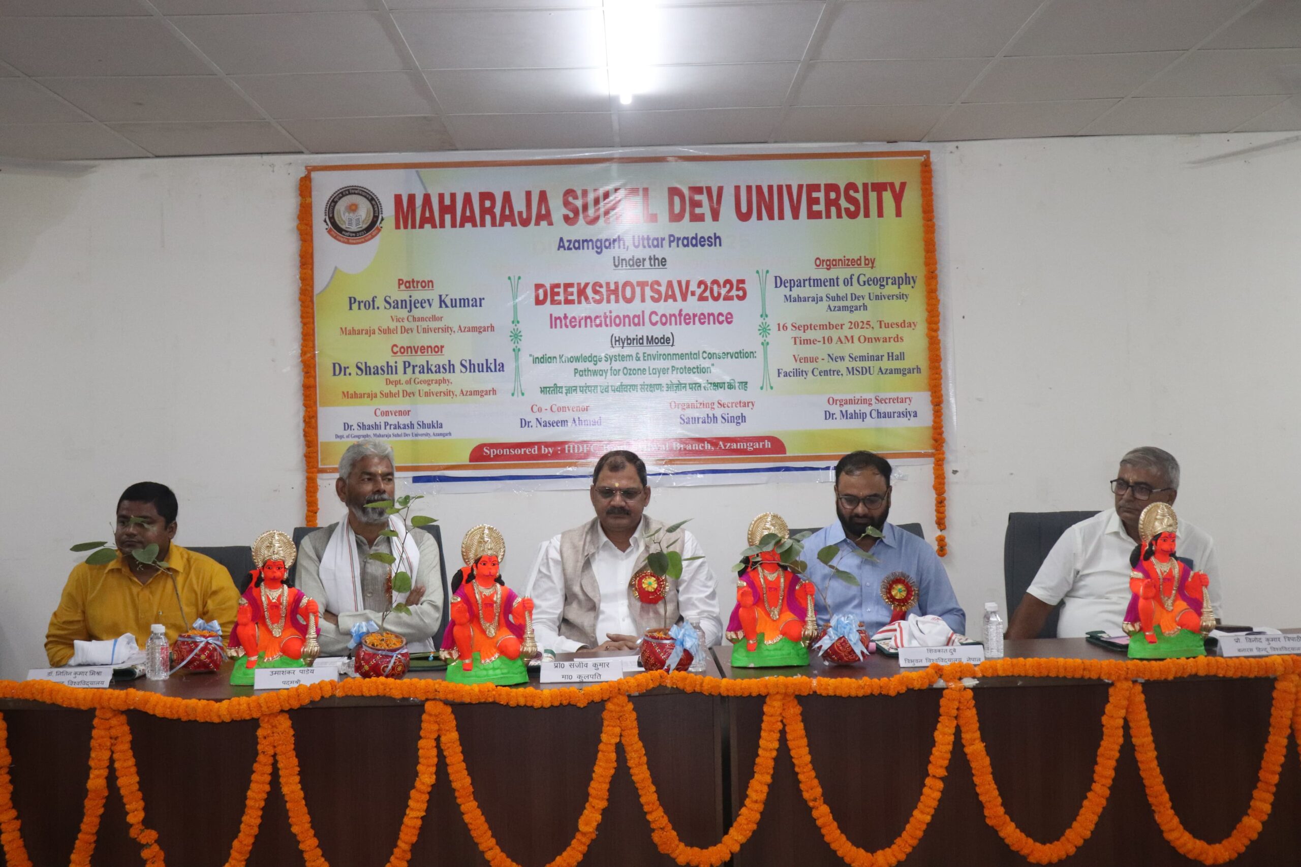 आजमगढ़। महाराजा सुहेलदेव विश्वविद्यालय, आजमगढ़ के न्यू फैसिलिटी सेंटर में भूगोल विभाग द्वारा भारतीय ज्ञान प्रणाली और पर्यावरण संरक्षण विषय पर बृहद सेमिनार आयोजित किया गया। कार्यक्रम की अध्यक्षता कुलपति प्रो. संजीव कुमार ने की जबकि मुख्य अतिथि जल प्रहरी पद्मश्री उमाशंकर पांडेय रहे।
