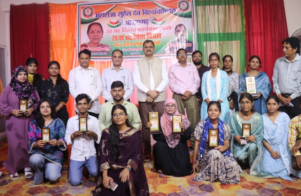 आजमगढ़। राजभवन, भारत सरकार एवं उत्तर प्रदेश सरकार के निर्देश पर, विश्वविद्यालय के कुलपति प्रो. संजीव कुमार के मार्गदर्शन में 2 से 15 अगस्त तक ‘हर घर तिरंगा 2025’ कार्यक्रम के तहत विभिन्न प्रतियोगिताओं का आयोजन किया गया। सेमिनार हाल में कविता, भाषण और गायन प्रतियोगिता में छात्रों ने उत्साहपूर्वक भाग लिया। विजयी प्रतिभागियों को सम्मानित करने के लिए प्रशासनिक भवन के पोर्च में भव्य पुरस्कार वितरण समारोह हुआ, जिसकी अध्यक्षता कुलपति प्रो. संजीव कुमार ने की।